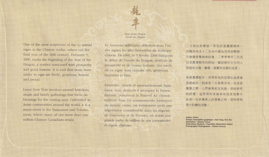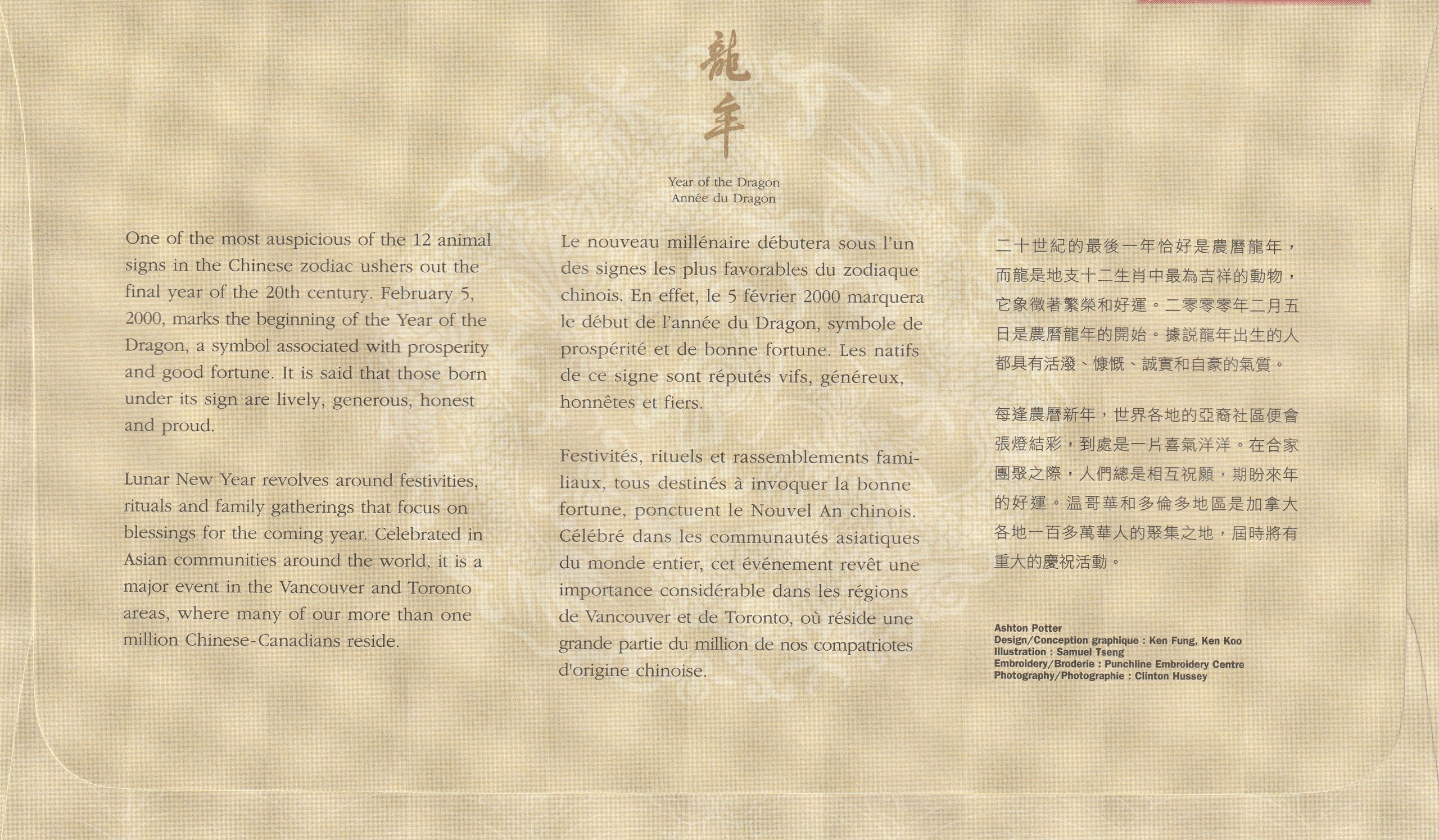 2000 Canada FDC Scott catalogue number 1836 Lunar New Year – 4 Year of the Dragon.