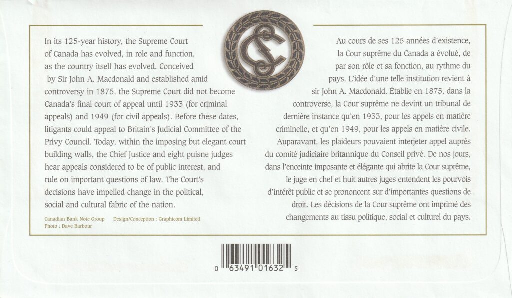 2000 Canada FDC Scott catalogue number 1847 The Supreme Court of Canada (Upper Right Plate Block).