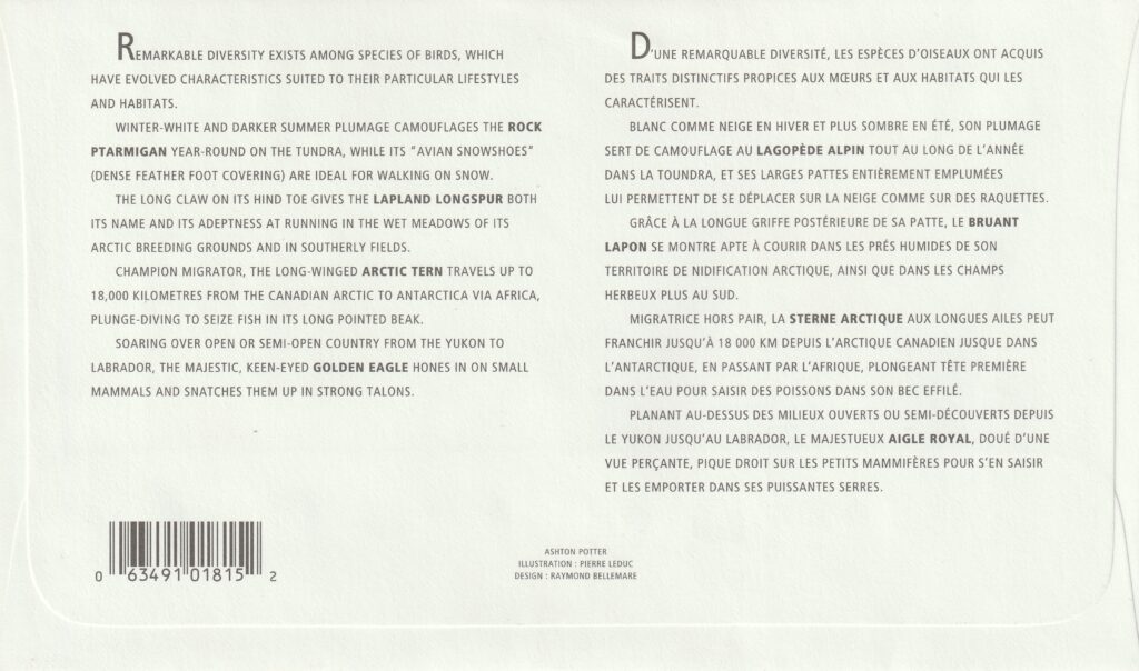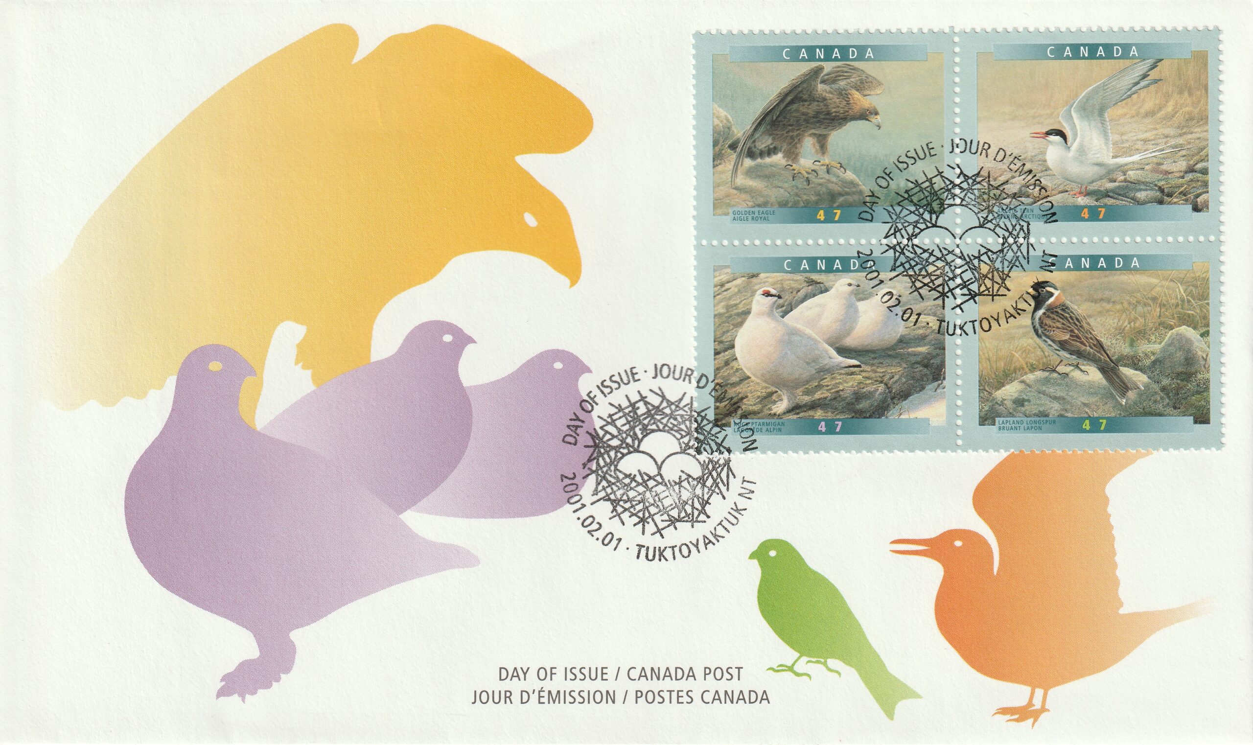 2001 Canada FDC Scott catalogue number 1889a Birds of Canada – 6. Se-tenant block of 4 containing 1886 – 1889. 1886 Golden Eagle, 1887 Artic Tern, 1888 Rock Ptarmigan & 1889 Lapland Longspur.