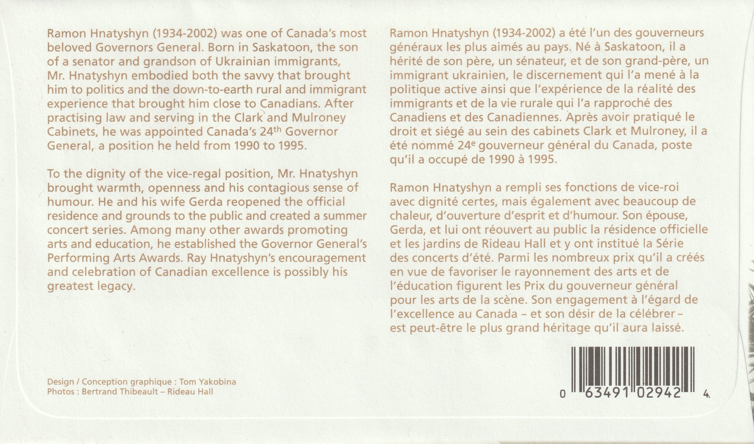 2004 Canada FDC Scott catalogue number 2024 Ramon John Hnatyshyn (Upper Left Plate Block).