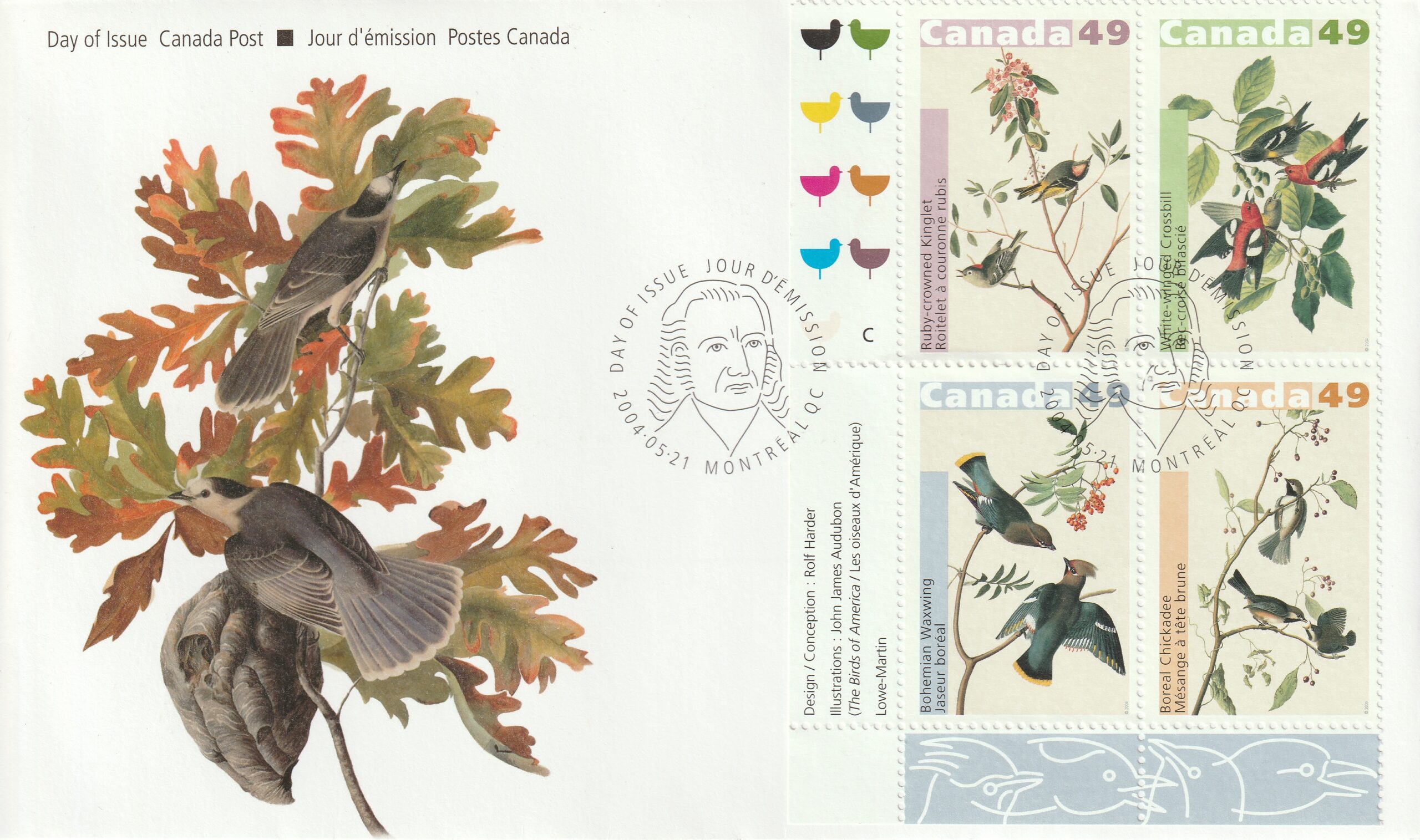 2004 Canada FDC Scott catalogue number 2039a John James Audubon’s Birds – 2. Lower left plate block containing 2036 – 2039. 2036 Ruby-crowned Kinglet, 2037 White -winged Crossbill, 2038 Bohemian Waxwing & 2039 Boreal Chickadee.