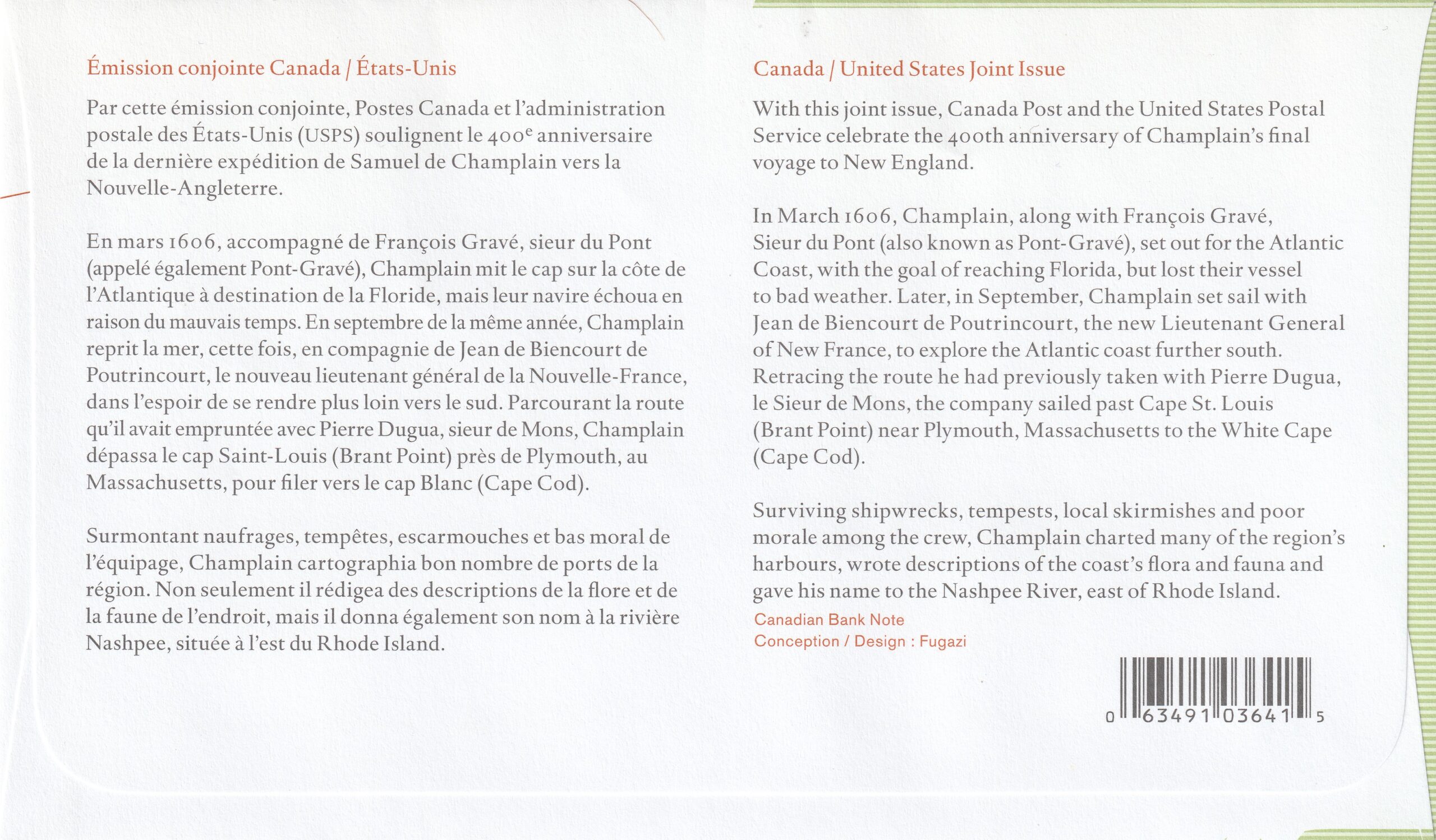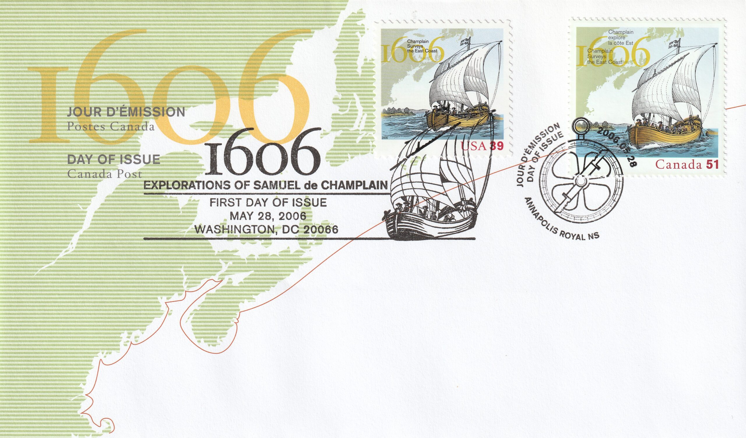 2006 Canada FDC Scott catalogue number 2155 Champlain Surveys the East Coast (Joint Issue with USA Scott catalogue number 4074a).