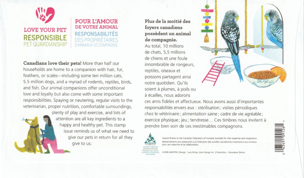 2015 Canada FDC Scott catalogue number 2829 Love Your Pet. Souvenir Sheet of 5 containing 2829a – 2829e. 2829a Single cat in head cone, 2829b Dog chasing snow ball 2829c Cat at vet, 2829d Dog drinking & 2829e Cat on leash.